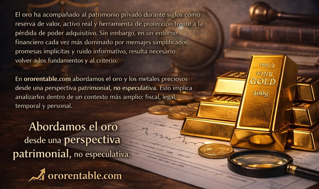 En ororentable.com abordamos el oro y los metales preciosos desde una perspectiva patrimonial, no especulativa. Esto implica analizarlos dentro de un contexto más amplio: fiscal, legal, temporal y personal. El oro no es un producto financiero tradicional ni un instrumento diseñado para generar rentabilidades automáticas, sino un activo físico cuyo comportamiento depende de múltiples factores económicos y monetarios, especialmente cuando se analiza en horizontes de medio y largo plazo.
